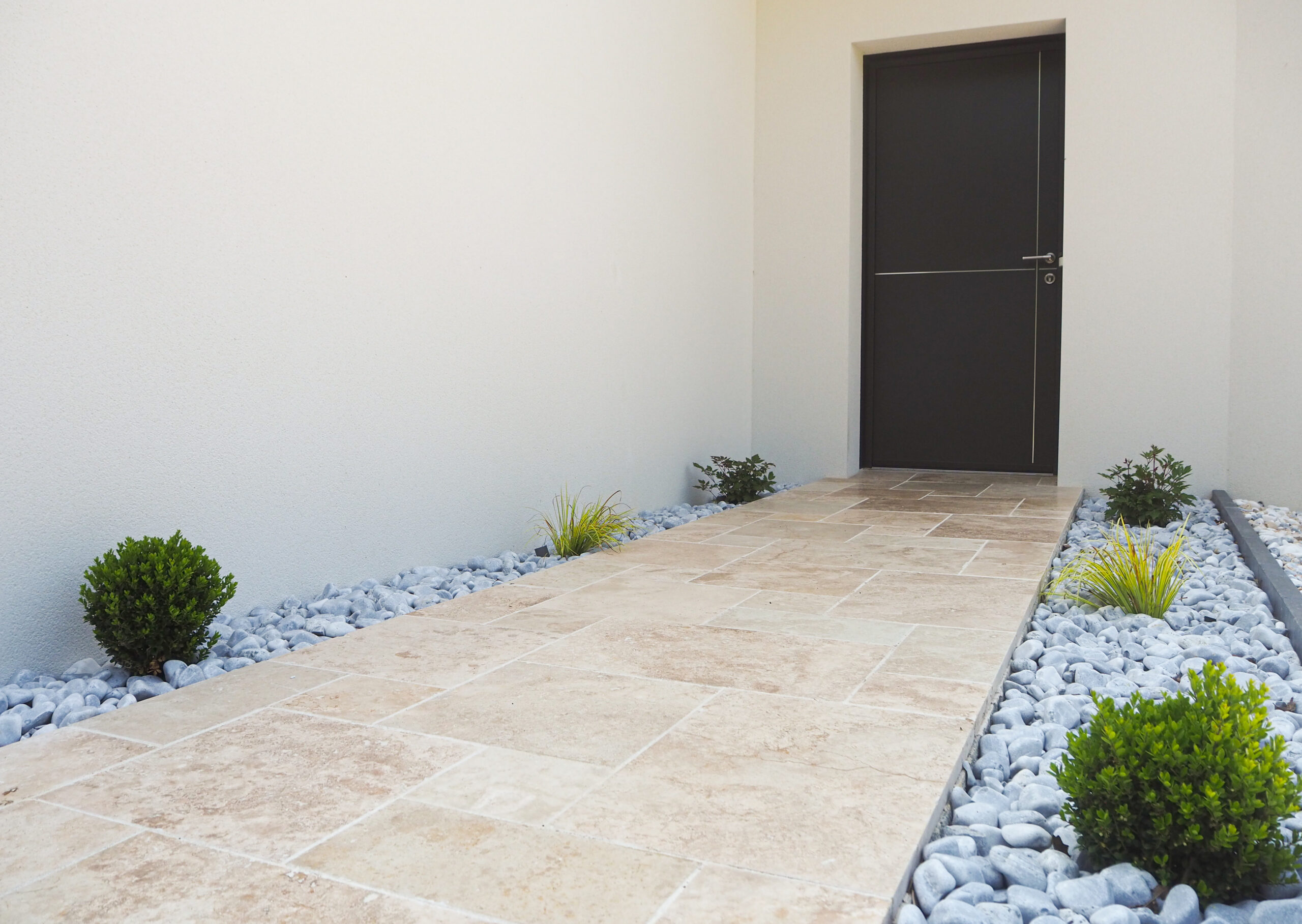 Allée - béton poreux gris et pavés travertin - Ideallée